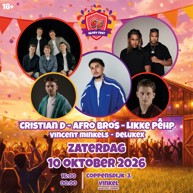 Welkom op onze website en leuk dat je een kijkje neemt om ons beter te leren kennen! Waar je van de shotjesbar door zult stromen naar de dansvloer en uiteindelijk op zondag kunt nagenieten van die heerlijke kater! Bij Gloryfest ga je het allemaal mee maken. Genieten zul je zeker doen! Wij als organisatie vinden het ontzettend mooi om iedereen uit de omgeving Maasdonk een keer per jaar te verwelkomen op ons unieke event! Mooie momenten creëren met en van elkaar! Gloryfest heeft vijf edities achter de rug met elk een eigen bijzonder randje. Zaterdag 10 oktober zal de zesde editie plaats vinden met Cristian D, Likke Pêhp, Afro Bros en veel meer! Deze dag gaat voor goud, samen met jou!